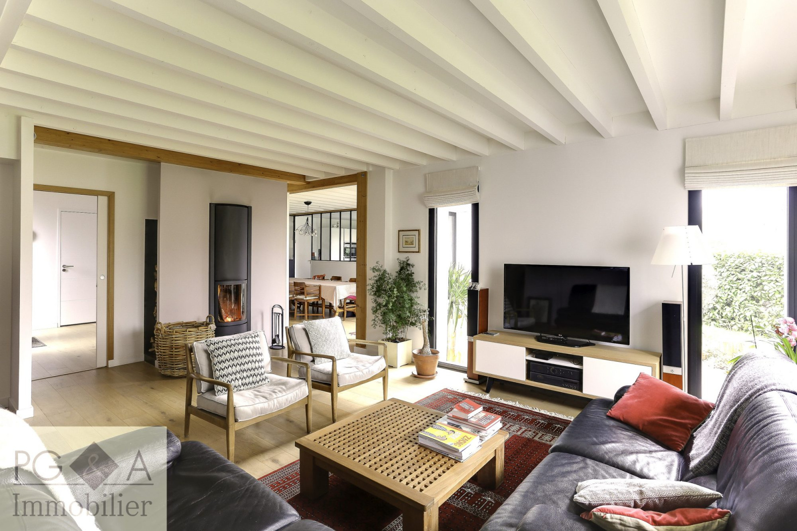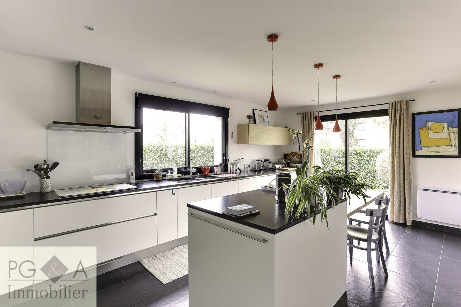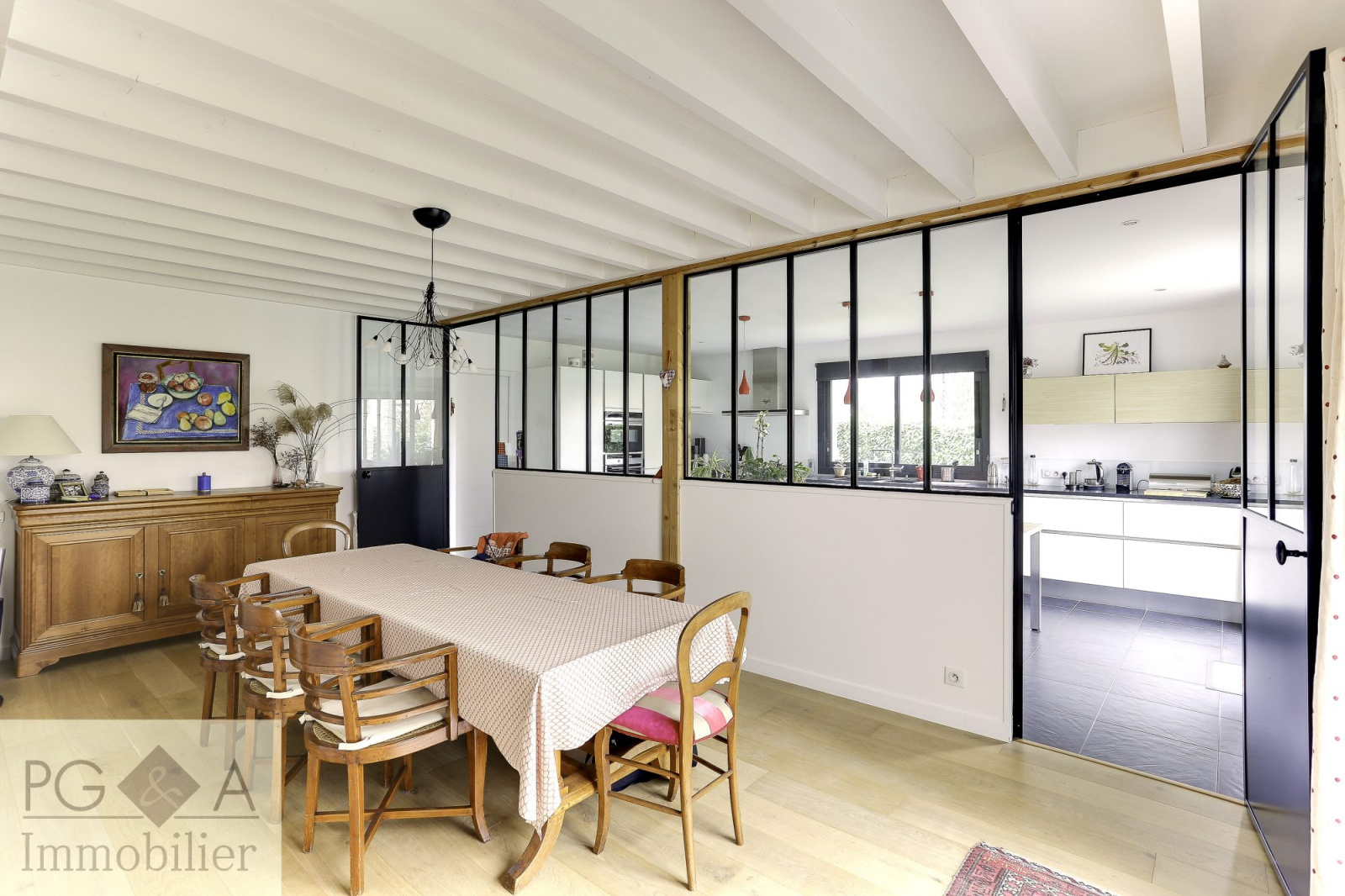 Pacé (35740)En dehors de ces atouts techniques, la maison offre de beaux et lumineux volumes et se compose de la sorte: entrée, salon avec poêle à bois, salle à manger, cuisine équipée, aménagée, séparée par une verrière métallique de qualité, suite parentale avec SDB et douche, dressing, WC privatif, bureau(chambre possible).